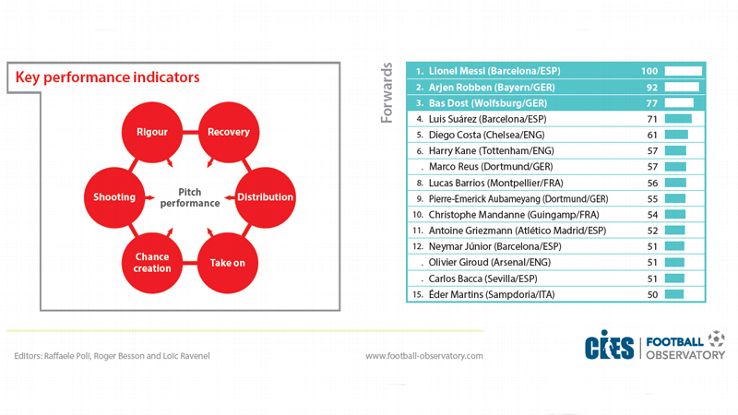 The CIES study assessed players in La Liga, the Premier League, the Bundesliga, Ligue 1 and Serie A according to six Key Performance Indicators (KPIs) -- shooting, chance creation, take-ons, distribution, recovery and rigour.
